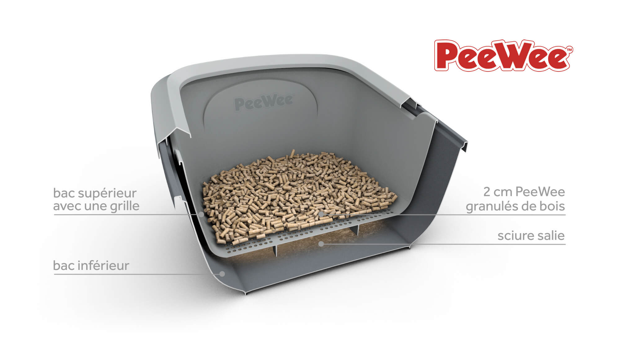 PeeWee ne fonctionne que lorsque le bac à litière PeeWee et les granulés de bois PeeWee sont utilisés ensemble.